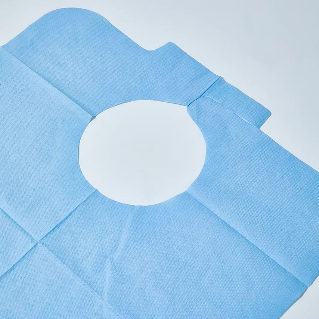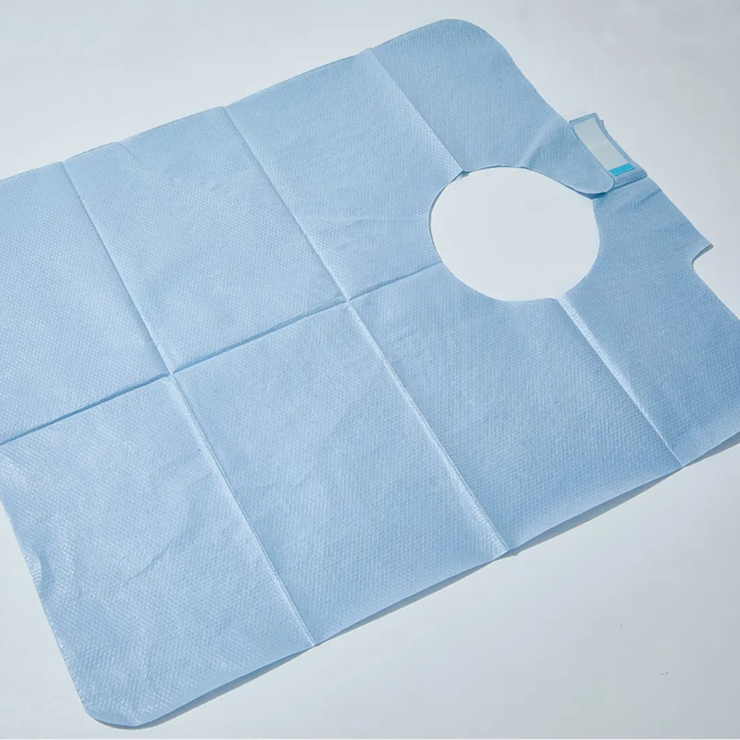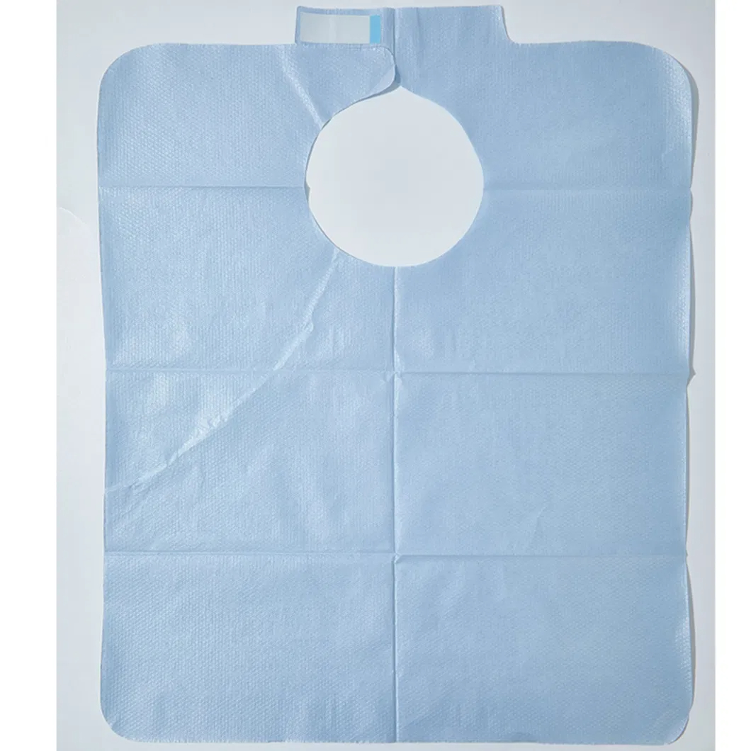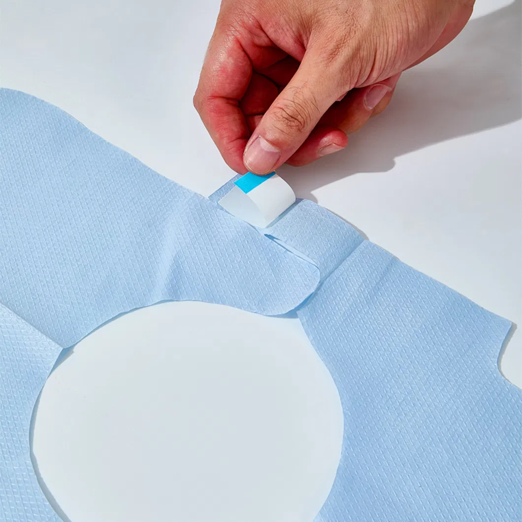 Cobertura estilo avental e ajuste versátil: O design versátil dos babadores odontológicos para clínicas e hospitais cobre o peito e o colo, oferecendo maior proteção durante os procedimentos.