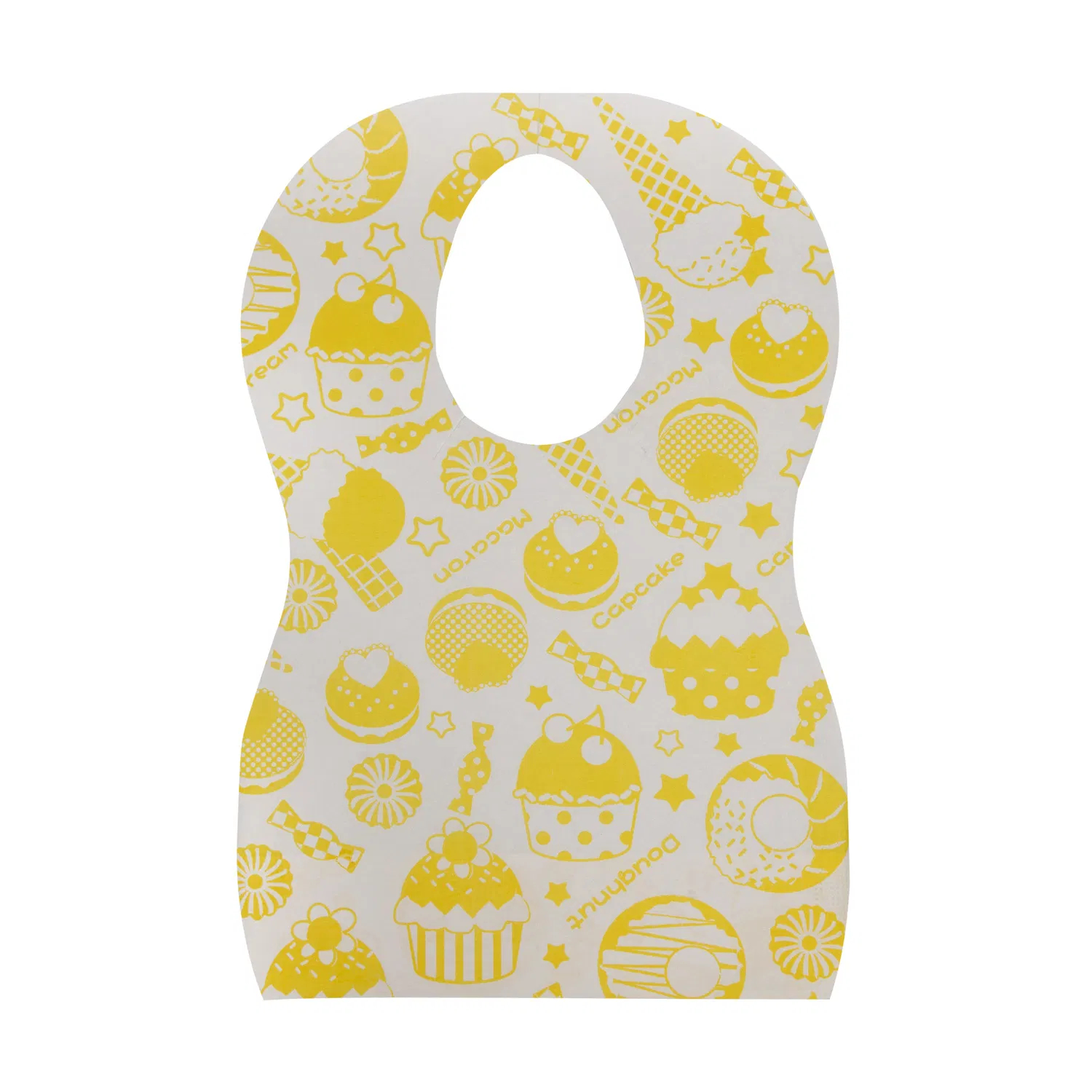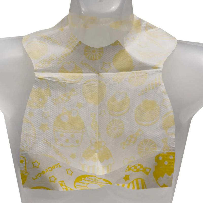 Avental descartável para bebês com bolso para papel, feito de material PE, impermeável e com possibilidade de impressão de diversos padrões.