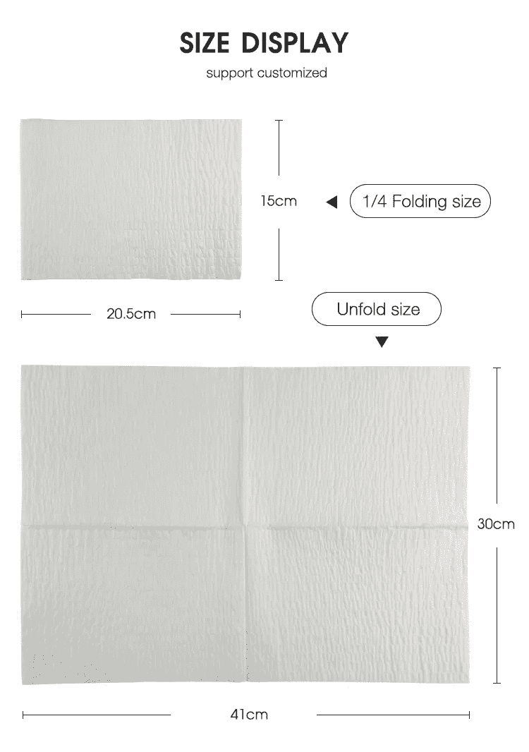 A: O tamanho é 30cm×40cm, estrutura de 3 camadas com 55g por unidade, ideal para uso diário descartável.